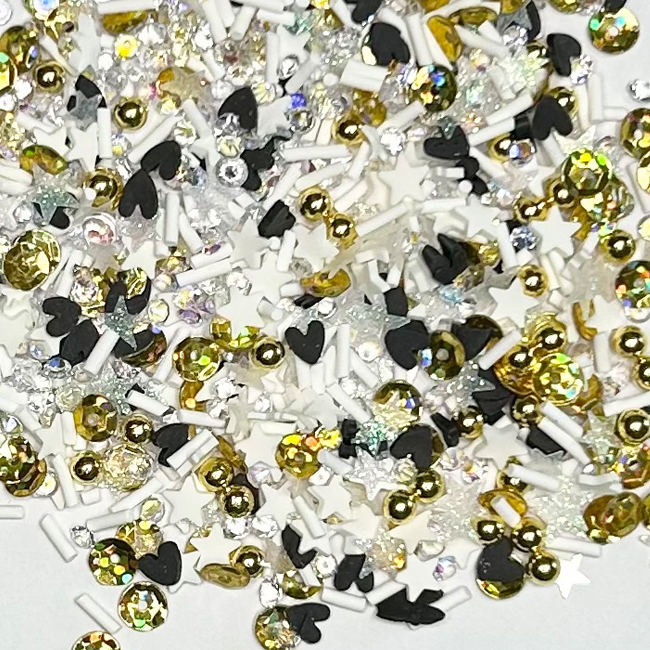 This set is a mix of star, heart and sprinkle clay slices, glitter sequins, gold balls and cup sequins as well as crystal rhinestones.