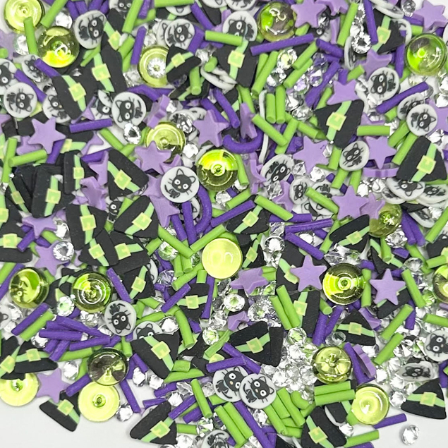This set is a mix of witch hat, black cat, star and sprinkle clay slices along with glass rhinestones and acrylic beads.