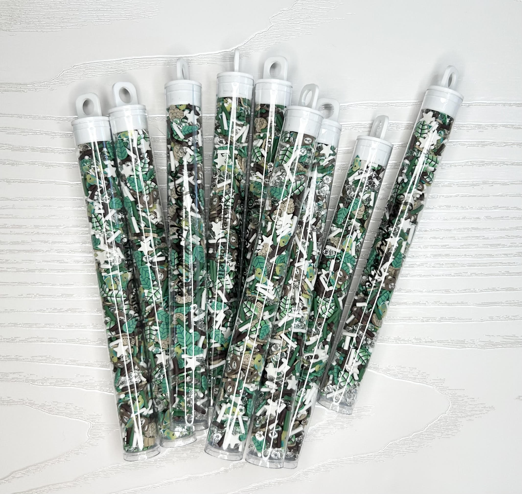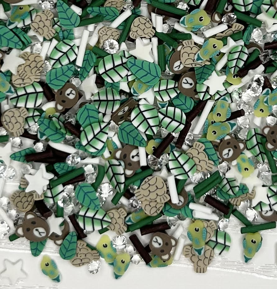 This set is a mix of fish, bears, stars, leaves and sprinkle clay slices along with glass rhinestones. Size of pieces vary from 1mm to 3mm.