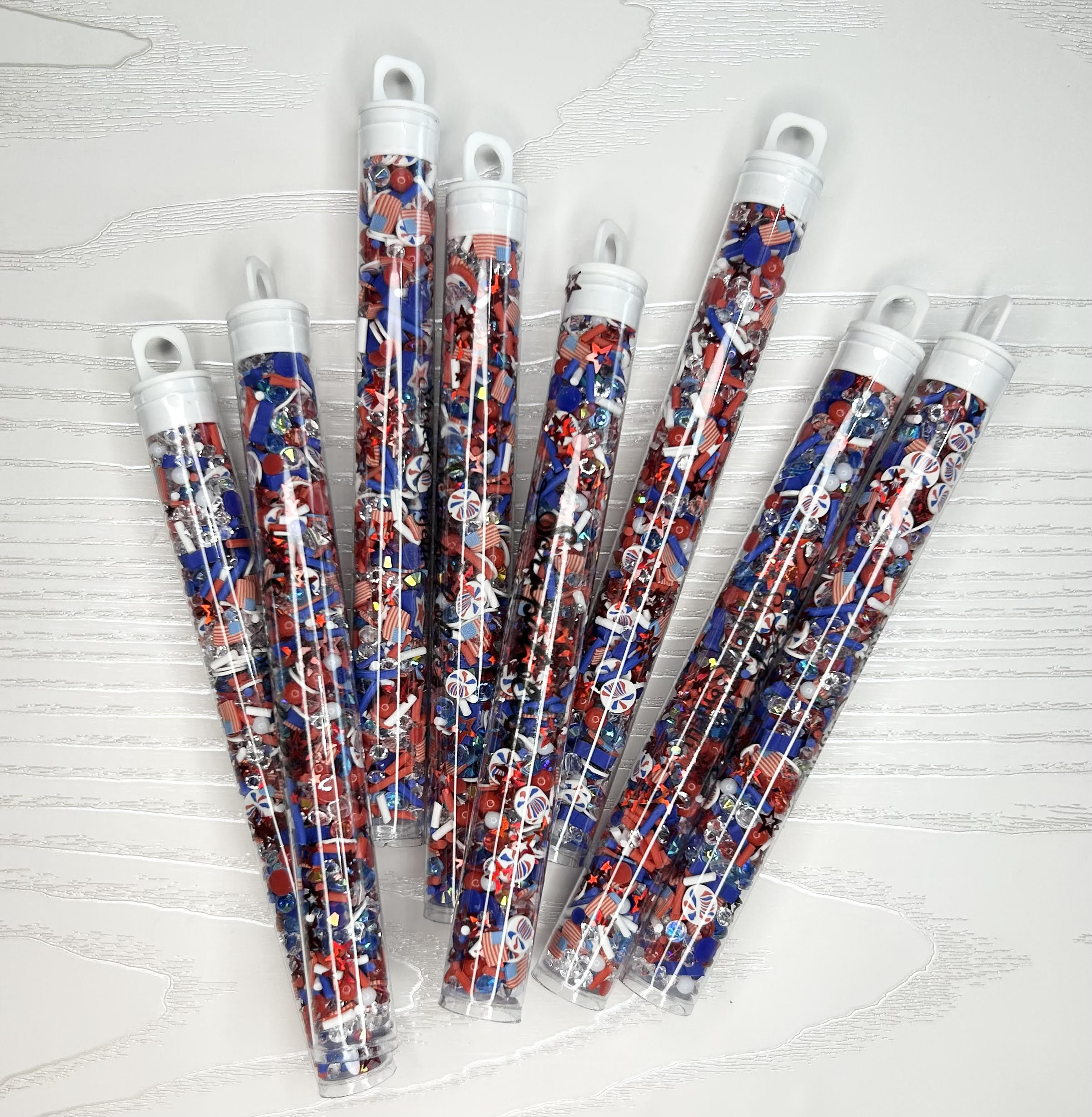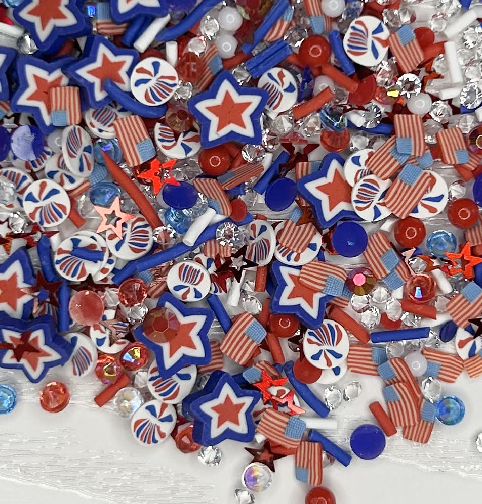 This set is a mix of stars, fireworks, American flags and sprinkle clay slices along with glass rhinestones, star sequins and acrylic rhinestones and balls. Size of pieces vary from 1mm to 6mm.