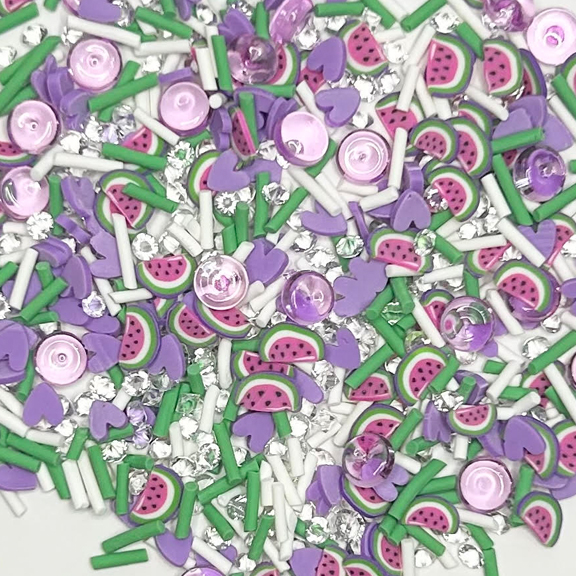 This set is a mix of watermelon, heart and sprinkle shaped clay slices along with glass and acrylic rhinestones. Size of pieces vary from 1mm to 4mm.