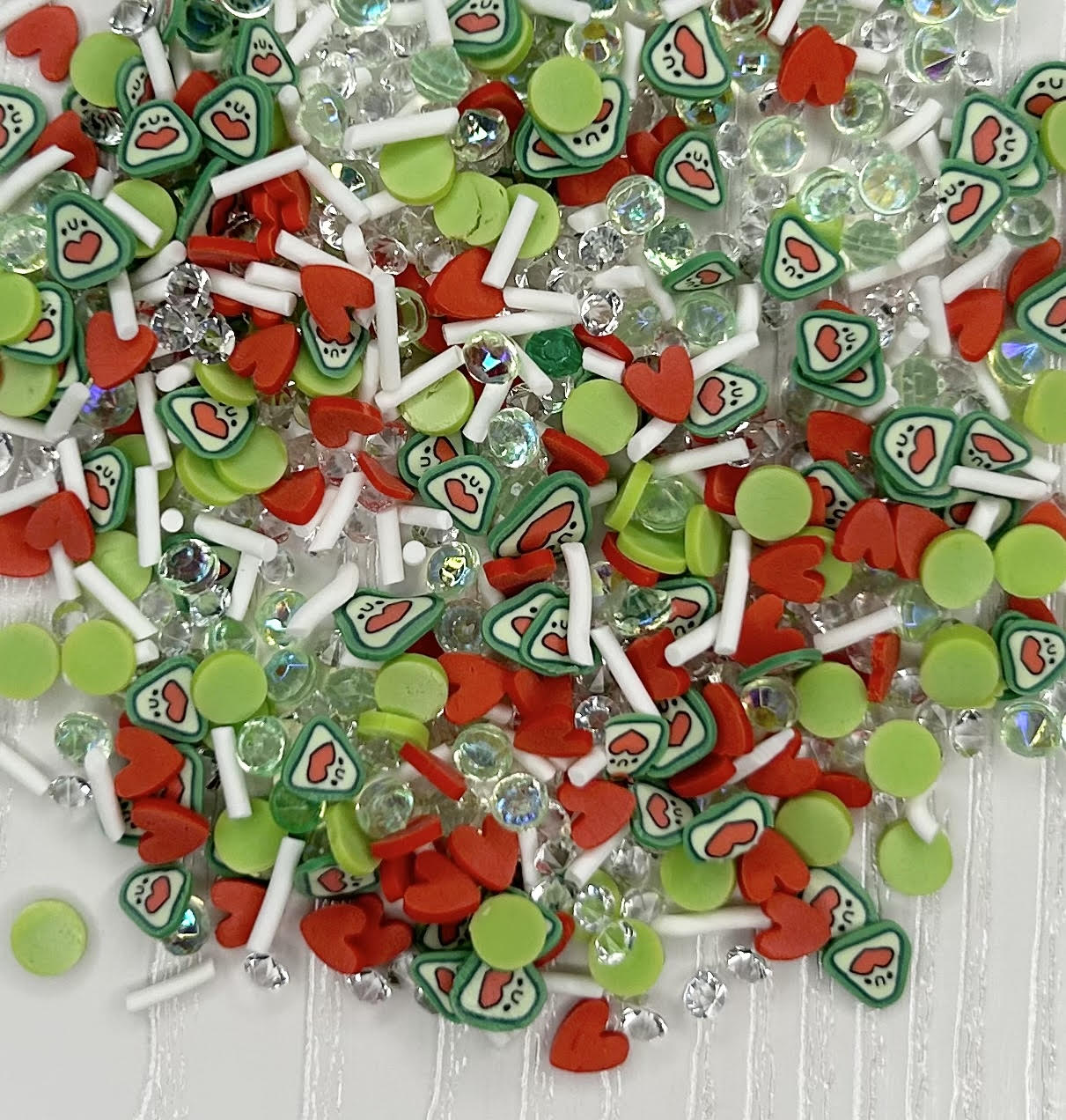 This set is mix of avocados, hearts, circles and sprinkle clay slices along with acrylic and glass rhinestones. Size of pieces vary from 1mm to 4mm.