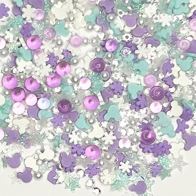 This set is a mix of mouse head and snowflake clay slices along with acrylic beads, pearls, glitter sequins and glass rhinestones.
