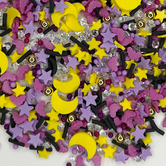This set is a mix of moon, star and sprinkle clay slices along with glass rhinestones and acrylic balls. Size of pieces vary from 1mm to 4mm.