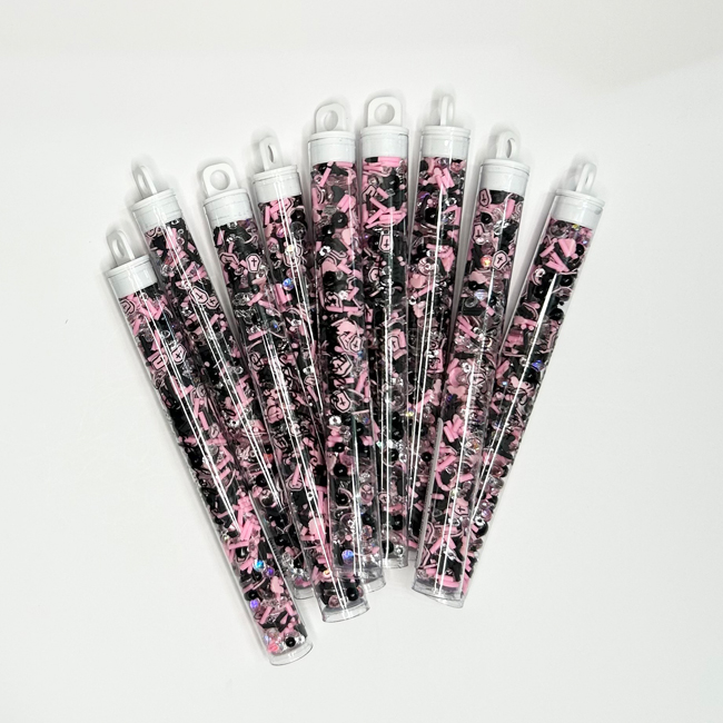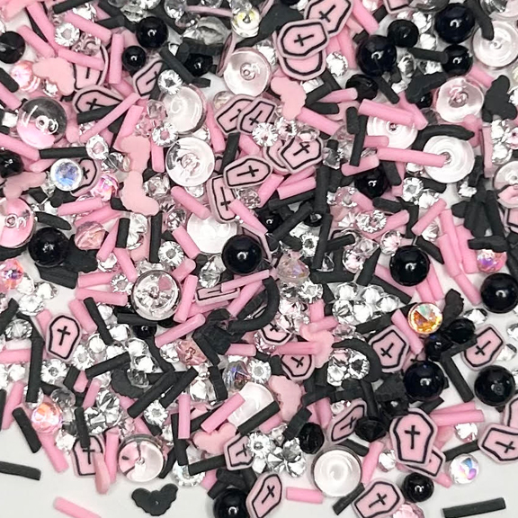 This set is a mix of bat, coffin and sprinkle shaped clay slices along with glass rhinestones and acrylic beads. Size of pieces vary from 1mm to 5mm.