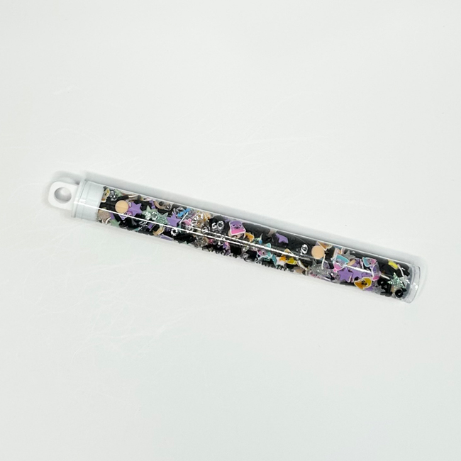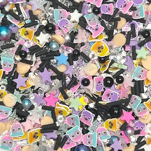 This set is a mix of star, alien and sprinkle shaped clay slices along with glass rhinestones, acrylic beads, and sequins. Size of pieces vary from 1mm to 5mm.
