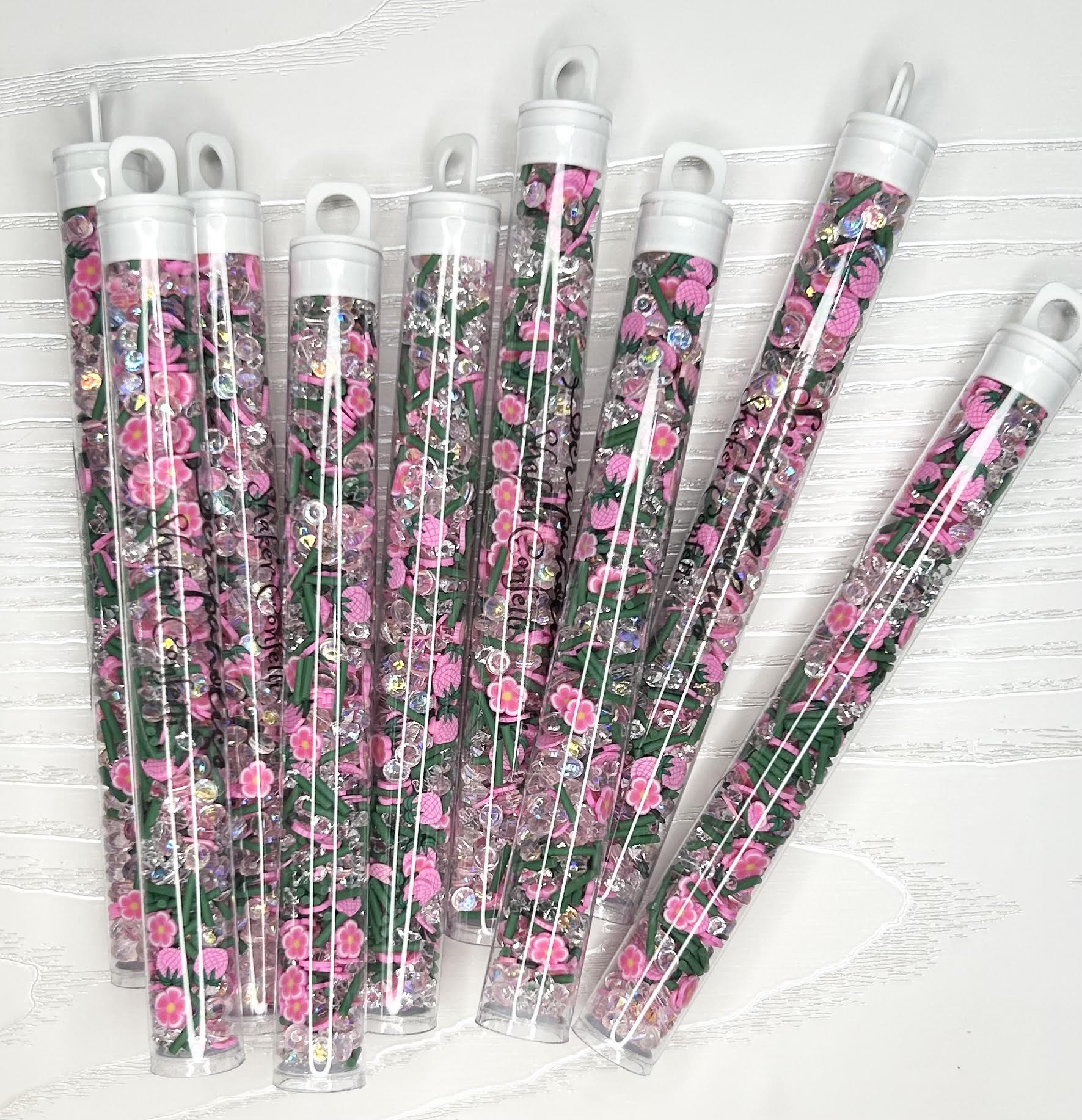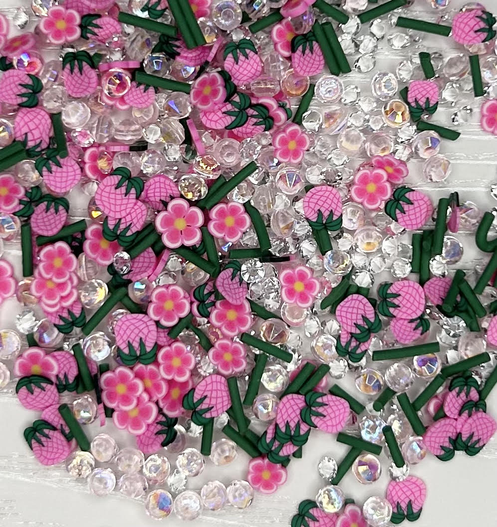 This set is a mix of pineapples, flowers and sprinkle clay slices along with glass and acrylic rhinestones. Size of pieces vary from 1mm to 4mm.