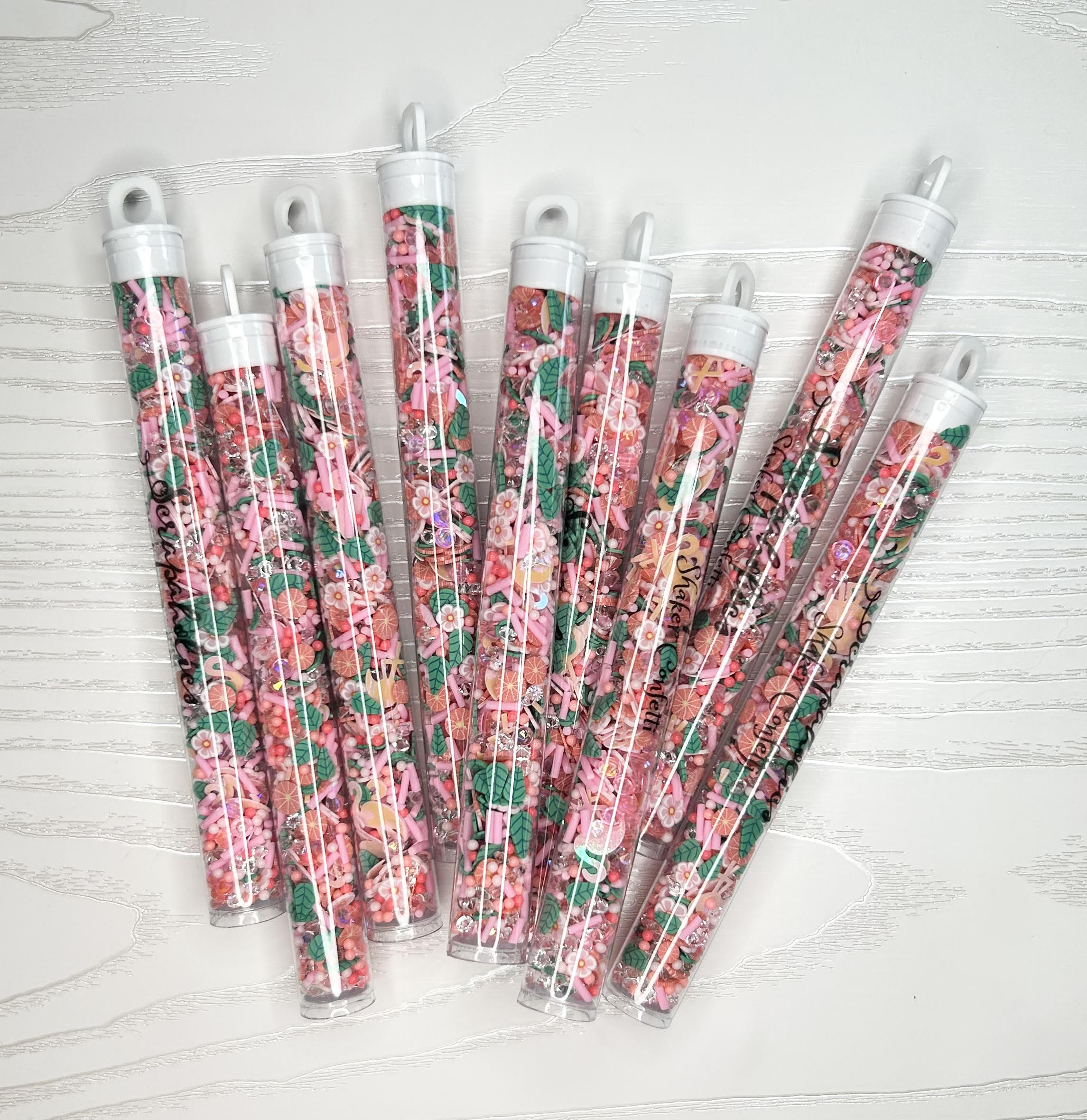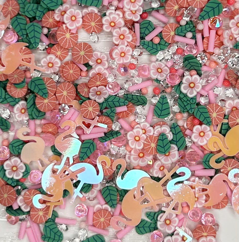 This set is a mix of leaves, grapefruits, flowers and sprinkle clay slices along with flamingo sequins and glass and acrylic rhinestones. Size of pieces vary from 1mm to 3mm.