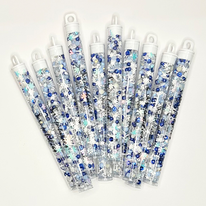 This set is a mix of snowflakes clay slices along with acrylic pearls, silver halfback rhinestones, glass rhinestones, acrylic rhinestones, and snowflake sequins.